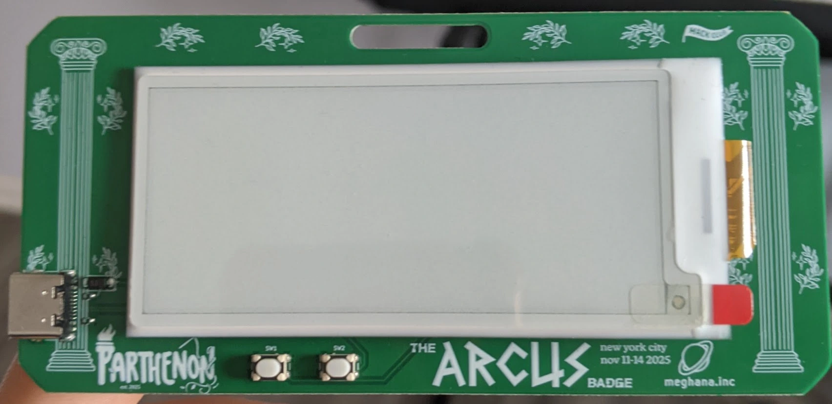 A PCB name badge I made for Hack Club's Parthenon, uses an RP2040 and an ePaper display.