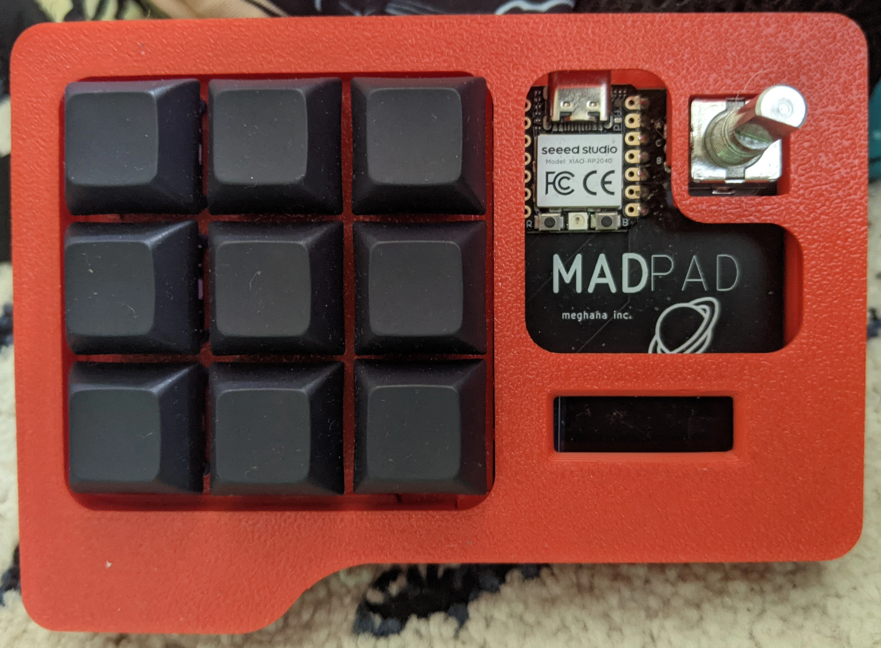 A custom Macropad using a XIAO RP2040 that has 9 keys, an OLED screen, and a rotatary encoder. The first PCB I ever made.